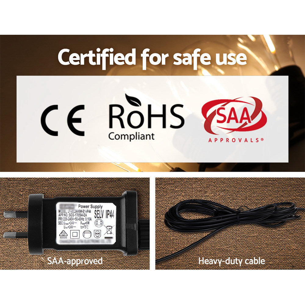 Our Jingle Jollys Festoon String Lights are great not only for wedding and birthday parties or special events, but also for creating a warm, inviting ambience with its bright and mellow glow. Suitable for both indoor and outdoor use, its IP44 rating means that it can be used in the rain and all weather conditions. Each bulb draws a very low voltage and is placed 90cm equally apart from each other throughout its 41m length for an even distribution of illumination and brightness. Not least, the each bulb has a 20,000 hours lifespan so that you can get to use the string lights for quite a while.